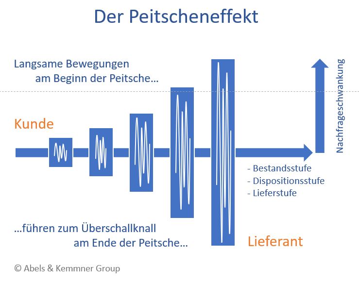 Wenn Sie später mit einem Schlag die um zwei Wochen verlängerte Wiederbeschaffungszeitverlängerung wieder herausnehmen, passiert der umgekehrte Mechanismus und der Nachfragestau führt zu einer Überbestandswelle, die sich durch die Supply Chain schiebt.Doch damit nicht genug: die Verbrauchs- bzw. Bestellhistorie der betroffenen Artikel zeigt zukünftig stärkere Schwankungen, die dazu führen können, dass die Sicherheitsbestände in der Supply Chain hochgefahren werden.