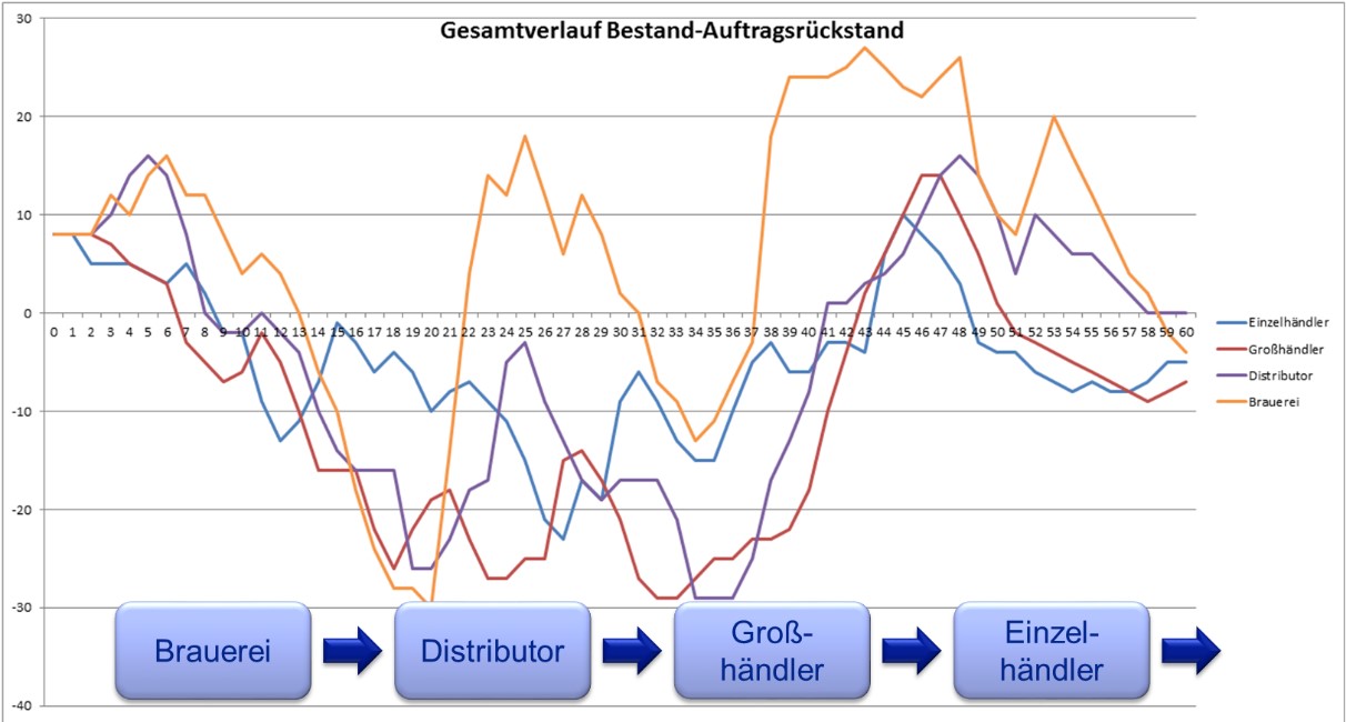Falls Sie das sogenannte „Beer Game“ nicht kennen, sollten Sie es sich einmal gönnen. In diesem Planspiel wird eine Lieferkette von einer Brauerei über einen Distributor, einen Großhändler und einen Einzelhändler bis zum Kunden abgebildet. In den einzelnen Lagerstufen müssen in jeder Spielrunde Entscheidungen über die nachzubestellenden Mengen an Bierkästen getroffen werden, sodass die Bestände möglichst niedrig und die Lieferbereitschaftgrade möglichst hoch bleiben. Jede Lagerstufe kennt nur die aktuellen Bestellungen der jeweiligen Kundenseite und entscheidet daraus selbständig, welche Mengen beim Lieferanten nachbestellt werden. Es ist spannend und unterhaltsam zu sehen, wie sich die Dispositionsmengen und Bestände aufschaukeln.