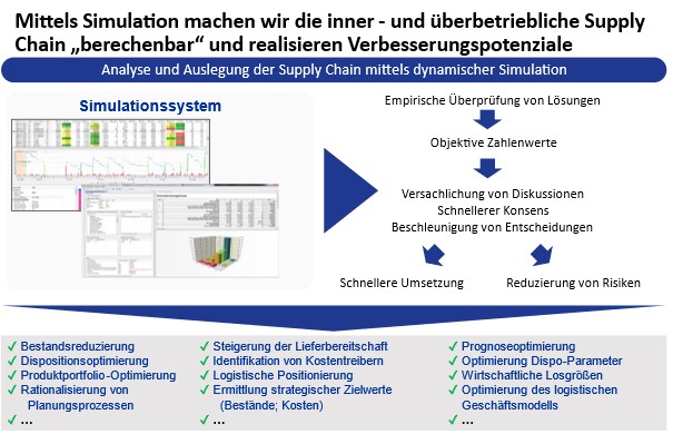 Bei vielen Optimierungsprojekten in Logistik und Supply Chain Management müssen Wertströme betrachtet und Veränderungen des Wertstrommodells, der Planungs- und Steuerungsmechanismen, der Lagerstufen, der Bestandsverteilung und vieles mehr vorgenommen werden. Bei einem klassischen Projektvorgehen ist dies mühsam, zeitintensiv und aufwändig. Das beginnt schon mit dem Zusammentragen der Daten. Will man Lösungsalternativen miteinander vergleichen und versucht dies über statische Berechnungen, die die Zeitdynamik des Geschehens in der Wertschöpfungs- und Lieferkette nicht berücksichtigen, sind die Ergebnisse unsicher und fragwürdig.