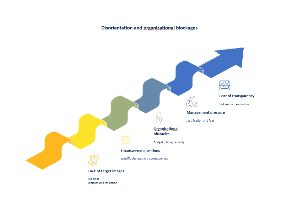 At the same time, there are significant blockages at the organisational level. Typical examples include a lack of budget, time and capacity constraints, pressure on middle management to justify their actions, and a fear of transparency and disclosure of accumulated legacy issues. These obstacles are rational and understandable – but they lead to initiatives being postponed, scaled back or avoided altogether.